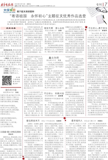 日前,由老年生活报与青岛市市南区老教育工作者协会联合主办、太保家园青岛国际康养社区冠名支持的第六届太保家园杯“寄语祖国 永怀初心”主题征文活动圆满结束。老教师们纷纷拿起笔抚今追昔,抒发了爱党、爱国、爱校、爱学生的情怀。现将部分优秀作品刊登如下(排名不分先后)。