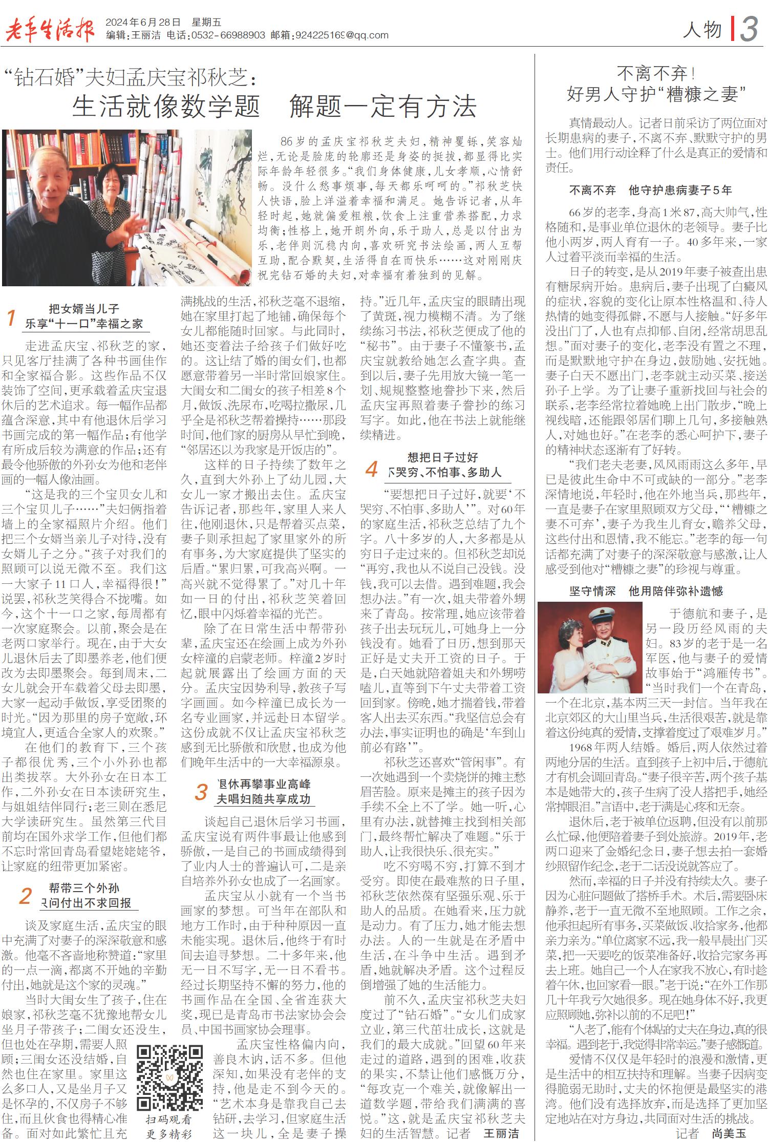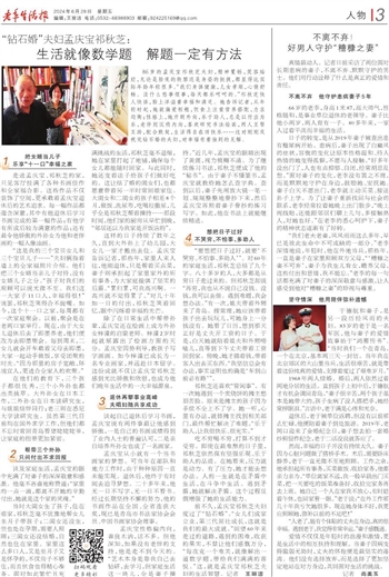 前不久,孟庆宝祁秋芝夫妇度过了“钻石婚”。“女儿们成家立业,第三代茁壮成长,这就是我们的最大成就。”回望60年来走过的道路,遇到的困难,收获的果实,不禁让他们感慨万分,“每攻克一个难关,就像解出一道数学题,带给我们满满的喜悦。”这,就是孟庆宝祁秋芝夫妇的生活智慧。记者 王丽洁