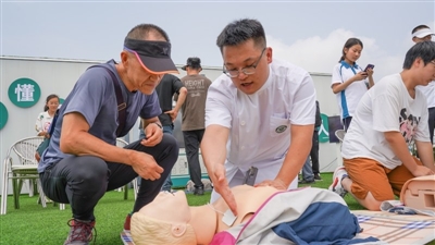 市民彭少峰在医护人员指导下学习急救技能。