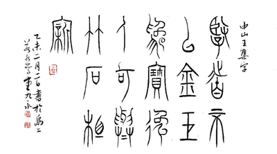 一位书法家不一定能篆刻,而爱好篆刻之人必定通晓书法艺术。“篆刻离了篆书是不行的,只有非常熟悉篆书,才能更好地组织印稿、设计印稿,除了篆书,行、草书都是随手用得到的。”缪九永说印稿的设计不仅要符合文字规范,还要与印面风格、图案相协调,布局考虑疏密、虚实、呼应等关系,达到一个好的视觉效果。