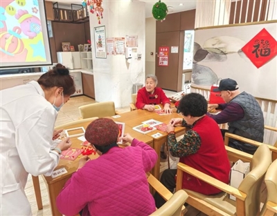 青岛中海锦年老年公寓组织入住老人开展春节手工活动。