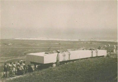 与之前采用滑运不同,运往火车站的这段路程要以滚运的方式完成。此时,一辆在解放前的推土机派上了用场。为防止巨石折断,它的下面要铺上厚厚的钢板,钢板下是枕木,枕木下是托木,最下面则是固定器。鉴于托木必须是结实耐磨的大木材,所以专门到五莲购买柿子树。当地政府听说买树是为了运送人民英雄纪念碑的碑心石料,无论如何都不肯收钱,最后无偿赠送了四棵百年老柿树,每棵树的树干直径都在40厘米以上。