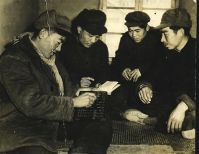 1957年12月,李钦堂(左二)作为到农村锻炼的青年干部,与麦岛农业合作社生产队干部在炕头上研究生产。