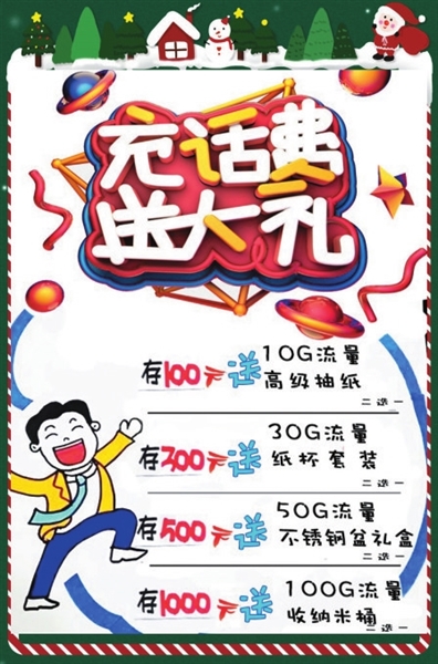 福利一,充话费、送大礼。进厅预存话费送礼品,存100元送10G流量或高级抽纸;存300元送30G流量或纸杯套装;存500元送50G流量或不锈钢盆礼盒;存1000元送100G流量或收纳米桶,礼品二选一,总有一款适合您!