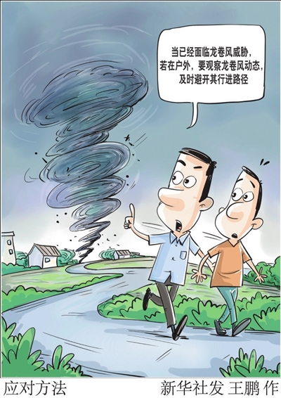 当临龙卷风威胁时,如果在户外,要观察龙卷风动态及时避开其行进路径,如果在室内,则远离门、窗和房屋的外围墙壁,躲在比较坚固的、永久性钢筋混凝土结构建筑物中抱头蹲下,最安全的地方是地下室或半地下室;在房屋倒塌等紧急情况下,应及时切断电源,以防触电或引起火灾;乘汽车外出遇到龙卷风时,应立即离开汽车到坚固的建筑物中或低洼地带躲避,同样需注意避开其行进路径。 李加减