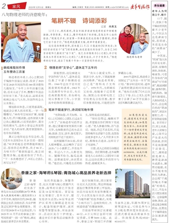 12月2日,寒风凛冽,青岛市86岁读者杨进希的家中却暖意融融,书香弥漫。书桌上,整齐码放的7本诗稿,是他五年心血的结晶。“刚做完手术,回家第一件事就是把这些稿子整理好,得给它们安个家才行。”杨进希抚摸着文稿,眼神中透着坚定。