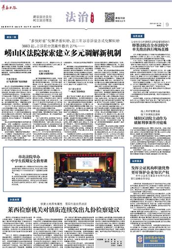与此同时,崂山区法院主动融入党委领导下的社会治理体系,将诉讼环节向前延伸,将审判效应向外拓展,努力把纠纷化解在基层,消除在萌芽状态。近三年,崂山区法院诉前分流案件13563件,以非诉讼方式化解纠纷3663起,占分流案件数的27%。2020年新收普通案件同比下降20%,结案率78.06%,同比提高20.58个百分点。