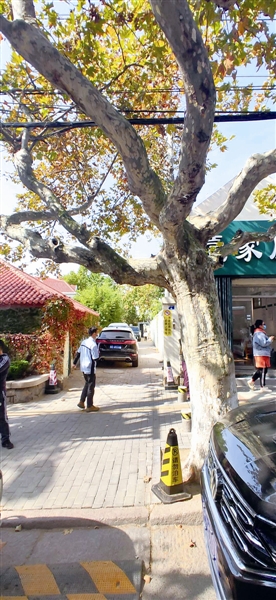 根据穆先生提供的线索,记者来到市南区江苏路实地探访。该小区共有两个单元,目前居住着9户居民。整个小区被围墙包围,只有一条东西向道路与江苏路连接。这棵法国梧桐树就在江苏路与小区道路交界处,直径约半米,分出六根主枝,其中一根主枝横在小区出口处,记者目测,该主枝的高度约2.2米,直径约有30厘米。