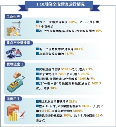 11月25日,市统计局发布了1-10月份全市经济运行情况。10月份,随着统筹推进疫情防控和经济社会发展一系列政策措施落细落实,企业生产经营活跃度不断提升,工业、服务业行业增长面继续扩大;消费、投资保持总体向好,出口延续较快增长;民生福祉较好保障。