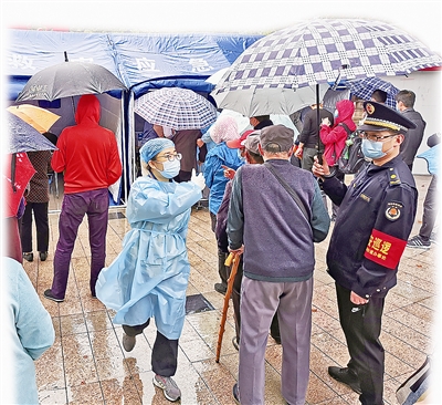 ■延安路街道综合行政执法中队工作人员为核酸检测居民雨中撑伞。