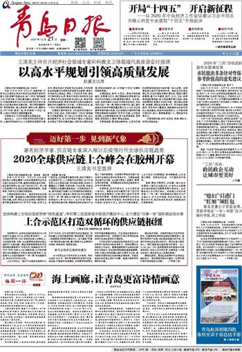 本报12月20日讯 今天上午,2020全球供应链上合峰会暨第八次供应链管理专业协会中国大会在胶州开幕,邀请全球著名经济学家、供应链专家等以线上线下结合的方式,深入探讨后疫情时代全球供应链的趋势和影响。省委常委、市委书记王清宪书面致辞。