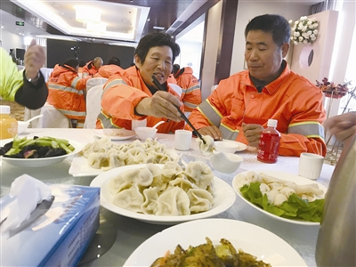 从2018年开始,西海岸新区公用事业集团已连续三年开展环卫工人冬至公益活动,让环卫工人吃上爱心饺子。在活动主会场,爱心商家和环卫工人们一起包饺子、吃饺子,在职工食堂、环卫工人公寓等5处分会场,包好的饺子直接送到了环卫工人手中。贾 臻 摄影报道