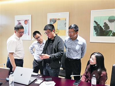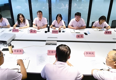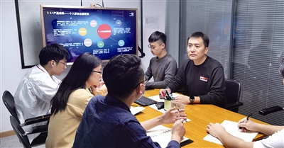 ■陈祥福(右一)在实训单位与团队讨论研究人才职业成长规划方案。