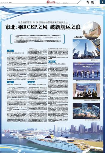 1月18日,RCEP青岛经贸合作先行创新试验基地全面开工仪式于青岛国际邮轮港区举行。顺势而为、乘势而上、聚势而强。借势RCEP,市北区要打造一个国际船舶管理集聚区。