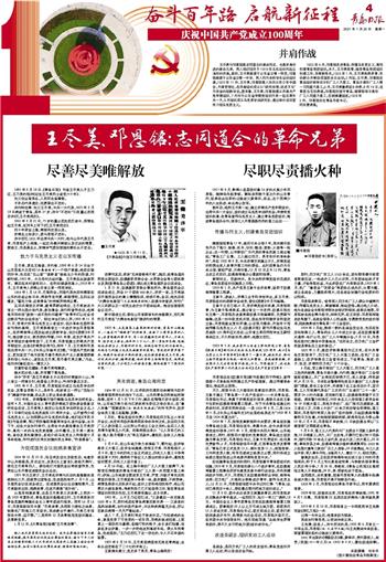 王尽美与邓恩铭是志同道合的革命同志,也是并肩作战的革命兄弟,两人相识结交于1919年五四运动风起云涌时的济南。其时,王尽美就读于山东省立第一师范,邓恩铭就读于山东省立第一中学,两人均为本校学生运动组织者。1920年11月,王尽美、邓恩铭等人效仿北京少年中国会、天津觉悟社,在济南组织成立以“研究学理,促进文化”为宗旨的励新学会。翌年春,王尽美、邓恩铭建立济南共产党早期组织,7月作为山东省早期党组织代表一起出席中共一大,9月组织成立马克思学说研究会,通过举办活动宣传介绍马克思主义。