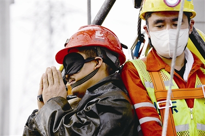 ■1月24日,一名被困矿工成功升井时双手合十以表感谢。 新华社照片