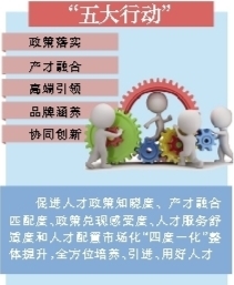 “五大行动” 政策落实 产才融合 高端引领 品牌涵养 协同创新 促进人才政策知晓度、产才融合匹配度、政策兑现感受度、人才服务舒适度和人才配置市场化“四度一化”整体提升,全方位培养、引进、用好人才