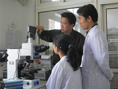 ■王印庚(中)在实验室指导研究生开展研究工作 。