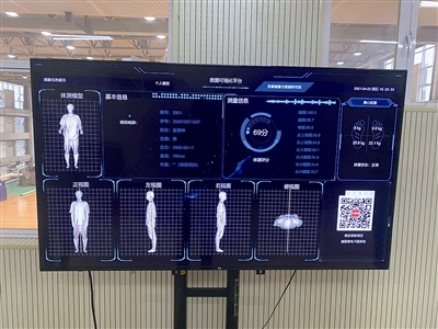 在此背景下,双方共同研发的两台3D人体成分扫描分析系统被引入校园,并很快在实践中大显身手。据介绍,这一分析系统包含四个分系统,分别是人体扫描测试系统、数据实时可视化系统、人体成分分析系统和运动处方生成系统。接受检测的学生只需站上仪器,跟随系统指令进行简单的肢体活动,5分钟后,包含BMI(身体质量)指数、肌肉含量、身体体态、体能及心肺功能等在内的13项核心指标就出现在现场的大屏幕上,一份通过大数据分析给出的个性化“运动处方”也随之出炉,学生可以通过微信扫码,在手机上查看、保存这些数据。