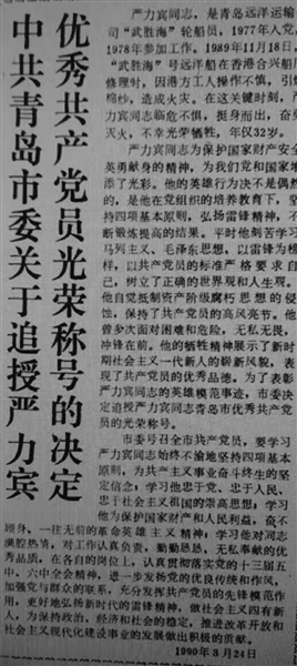 ②1990年3月24日,青岛市委追授严力宾优秀共产党员称号。