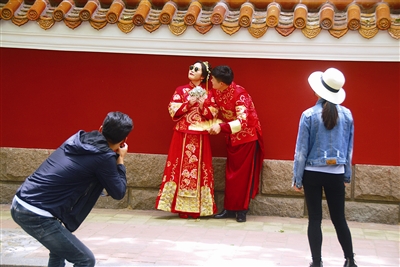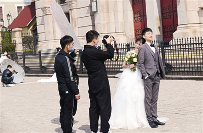 ■浙江路天主教堂、大学路红墙下……漫步于青岛景区,经常能看到拍摄婚纱照的新人。 王 雷 摄