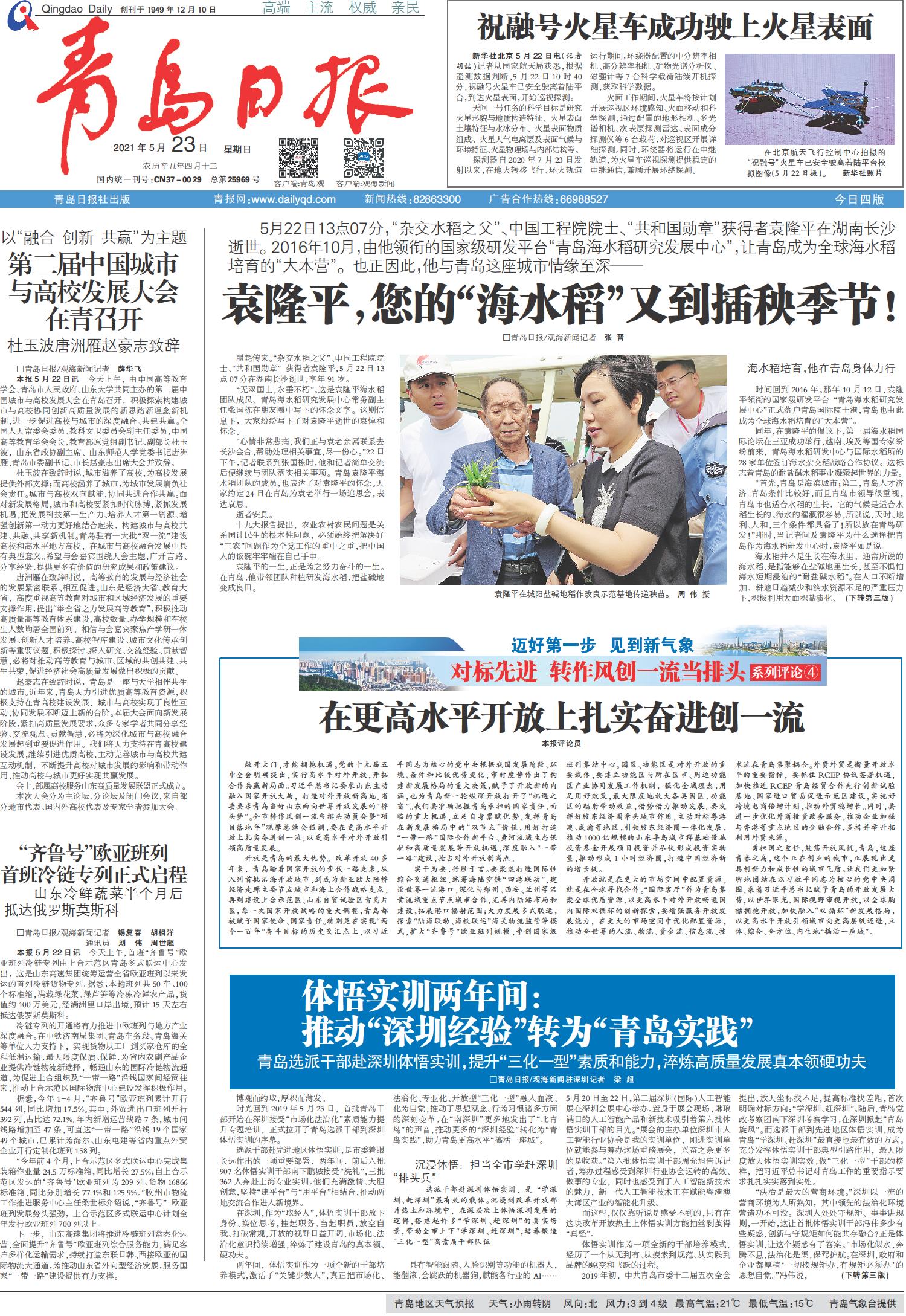“心情非常悲痛,我们正与袁老亲属联系去长沙会合,帮助处理相关事宜,尽一份心。”22日下午,记者联系到张国栋时,他和记者简单交流后便继续与团队落实相关事项。青岛袁隆平海水稻团队的成员,也表达了对袁隆平的怀念。大家约定24日在青岛为袁老举行一场追思会,表达哀思。