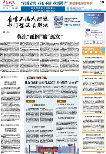 莫让“孤例”被“孤立”,不仅需要细致入微地了解百姓真实需要,还要发挥制度之力,推动服务机制的创新。近日,网友宋先生在观海新闻客户端“直通12345”平台留言建议:北京、河南等地在政务服务大厅设立了“办不成事窗口”,这样的窗口青岛人也需要!