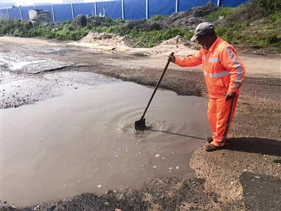 记者在现场采访了多位环卫人员,他们对坑洼路口也很无奈。“这个路口从6年前开始就坑坑洼洼的,雨后积水严重,车辆经过时都要减速慢行,此前还多次出现交通拥堵的情况。”在瑞海北路与滨江路路口,一位环卫工人讲述,道路破损也给环卫工作增加了困难,她曾多次向上级反映此事,虽然也有施工人员来修修补补,但没有彻底修复破损路面。