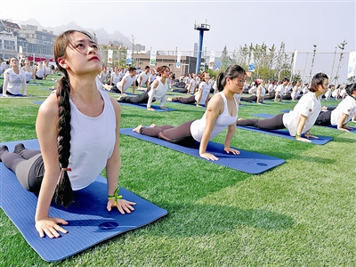 ■瑜伽爱好者们在户外活动。 王 雷 摄