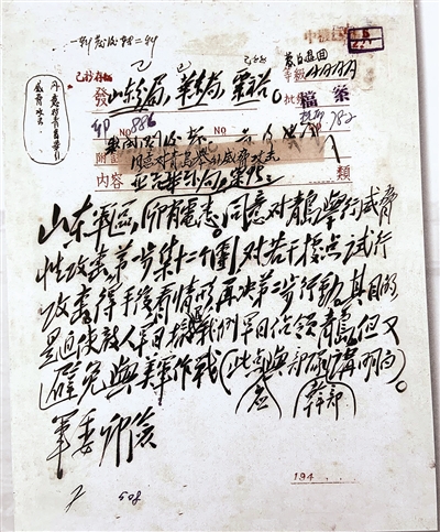 图二:1949年4月28日,毛泽东主席亲自拟写了《同意对青岛举行威胁性攻击》命令,批准山东军区发起青即战役,解放青岛。