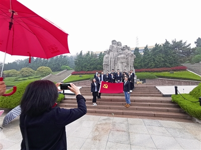 图六:青岛市革命烈士纪念馆院内,共产党员们在革命烈士塑像前合影。