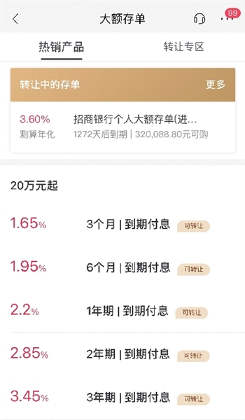 其他股份制银行大额存单利率会不会比国有大行高呢?打开招商银行APP,查看大额存单产品发现,大额存单产品利率有明显下调,但与上述提到国有大行的现行利率相比,差距不大。以20万元起购的产品来看,国有大行3个月期的利率要比招商银行高5个基点,6个月、1年、2年、3年期的利率要低5-15个基点。