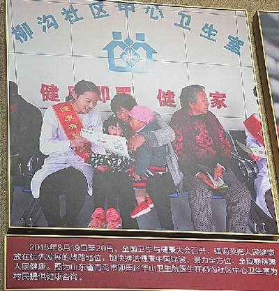 展览的第四部分,标注“即墨区华山卫生院医生在柳沟社区中心卫生室为村民提供卫生咨询”的一幅图片出现在记者眼前。这张图片体现的是青岛承担的一项国家试点任务。