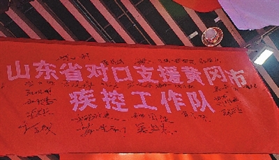 山东省对口支援黄冈市疾控工作队的队旗也被收录在此次展览中。记者从队旗上的签名中,发现了一个熟悉的名字——来自青岛市疾控中心的宋富成。他是这支驰援湖北黄冈疫情防控工作队中的青岛“独行侠”。