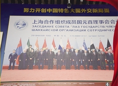 在中国共产党历史展览馆 “努力开创中国特色大国外交新局面”的主标题下,高悬着上合组织青岛峰会的大幅照片。