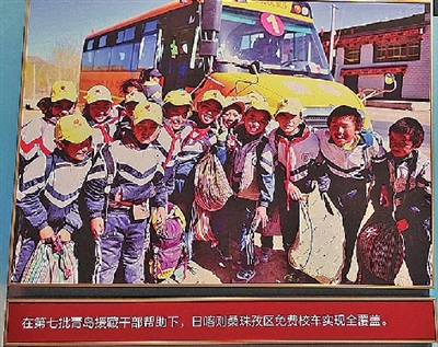 在中国共产党历史展览馆援藏工作专题下展出的照片中,一张照片让人倍感温暖:一群藏族孩子背靠黄色校车,头戴小黄帽,眼中洋溢着纯真的快乐……这样的场景,在青岛或许已经稀松平常,但在曾经的日喀则市桑珠孜区,却是只有在书本和电视上才能看到的画面。