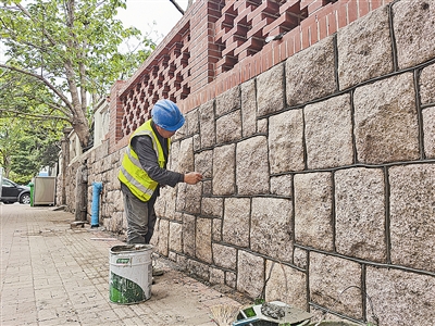 ▲工人正在对武定路18号刘子山别墅围墙进行修复。余瑞新 摄