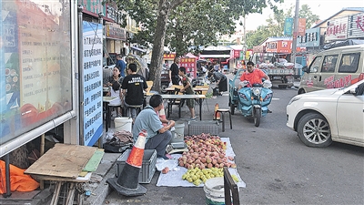 根据邓女士的指引,记者转到华中蔬菜批发市场以北的正定三路看到,这里也聚集了10多个流动摊位,人行道被乱停乱放的车辆以及早餐店摆放的桌椅占用,商贩们则将瓜果蔬菜等农产品直接摆在行车道上出售。