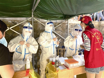 ■即墨医护人员在莱阳为当地居民进行核酸检测采样。