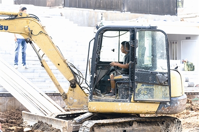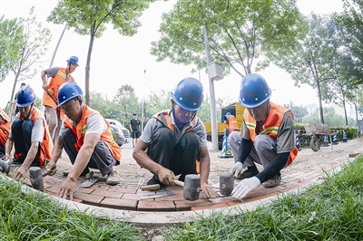 在路旁,市政工人们正在铺设人行道的地砖,尽管他们已经全副武装,做好了遮阳的措施,但身上的衣服依然不知被汗水浸透了多少遍,裸露在太阳下的皮肤也被晒得黝黑,布满了细密的汗珠。即使如此,为了尽快完成人行道铺设,不影响市民出行,他们手中的工具却没有半分停顿。