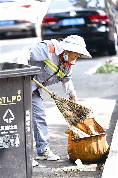 在街头,烈日下即便清扫垃圾这样的“小动作”也让人闷热难耐,路边的环卫工大姐却一丝不苟,耐心地将地上的每一片垃圾清理干净。宽阔的帽檐在烈日下显得有些“力不从心”,工作服挡得住阳光却挡不住高温,而她们,却步履不停。