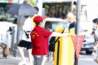 在十字路口,有一群身着红色志愿服务上衣、手持“文明赢得尊重”小旗的文明志愿者在人群中格外引人注目。在热浪的包裹中,他们有时候提醒行人按信号灯通行,有时候用手示意过往车辆减速慢行,有时候还会护送老人或儿童过马路,在这灼热的太阳下,尽心尽责地维持着交通秩序。