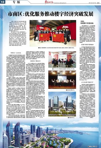 “市南区的党建引领,助推强化楼宇‘双招双引’”,北京中铁第一太平物业服务有限公司青岛分公司负责人表示,“2020年以来,受疫情影响,楼宇内空置率上升。通过红色党建牵线,结合市南全力提升服务、搭建平台、集聚人才等工作,中铁青岛中心从2020年初入驻率仅有70%,增长到了目前的82%,2021年新入驻企业14家。”