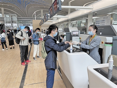 ■青岛航空值机柜台前,旅客正在办理手续。 周建亮 摄