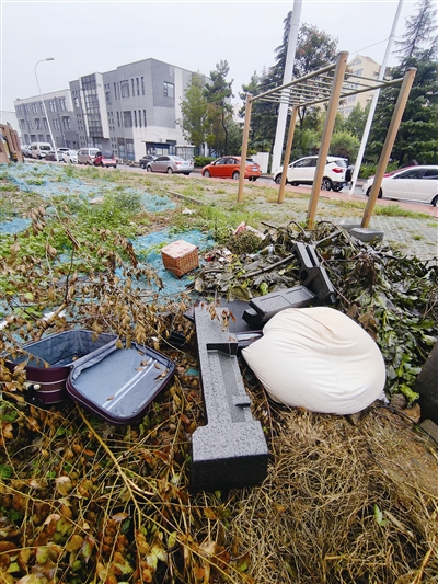 ■市北区银州路健身点垃圾遍地、荒草丛生。