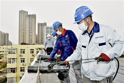 ■日前,市北区以争创全国文明典范城市为契机,发起“187攻坚行动”,把187项群众心头的“急难愁盼”分解成9大类进行专项攻坚。在老楼整治攻坚行动中,对165栋老楼院进行改造提升,解决群众期盼已久的楼体加装保温层、修复漏雨、维修防盗门等问题。图为敦化路街道组织施工人员为延吉路50号楼顶重新做防水处理。