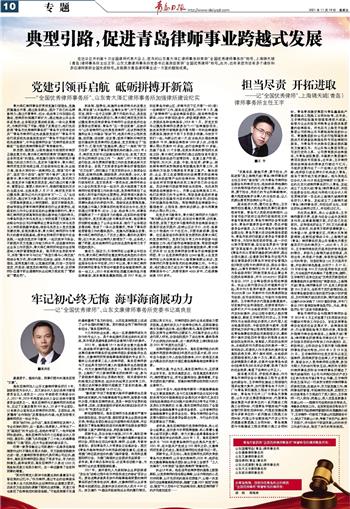 在近日召开的第十次全国律师代表大会上,我市的山东青大泽汇律师事务所荣获“全国优秀律师事务所”称号,上海锦天城(青岛)律师事务所主任王宇、山东文康律师事务所党委书记高良臣荣获“全国优秀律师”称号。此外,近年来我市还有多个律所和多位律师荣获全国先进称号。本版展示青岛律师事业这一方面的靓丽成果。