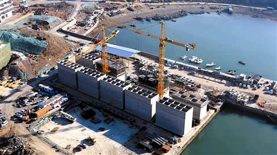 工程分为陆域和海域两部分,主要建设码头和陆域配套设施。目前陆域部分指挥通讯远程监控中心楼、码头生活周转库已实现主体封顶,船舶零部件仓库和船舶维修车间正在全面推进主体施工,建成后将承担船舶指挥调度、通讯及远程监控、科技研发、后勤补给、维护保养和冬季休整等功能;海域部分码头沉箱安装及海域推填工作推进平稳有序,水工工程进度达到30%。