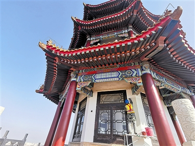 ■工人正在修缮观涛阁。 王 凯 摄