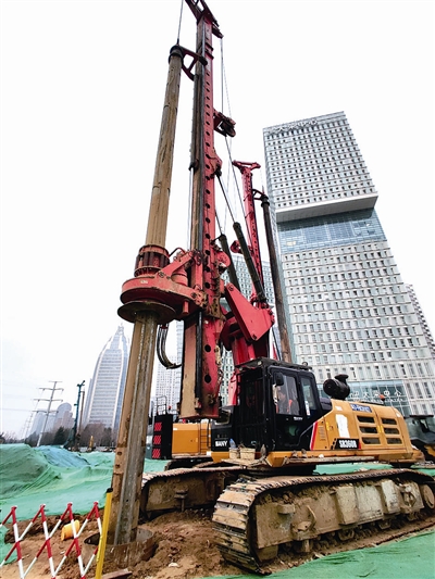 ■海尔路-银川路立交工程现场,伴随着桩机的轰鸣声,首棵桩基顺利开钻。 王冰洁 摄